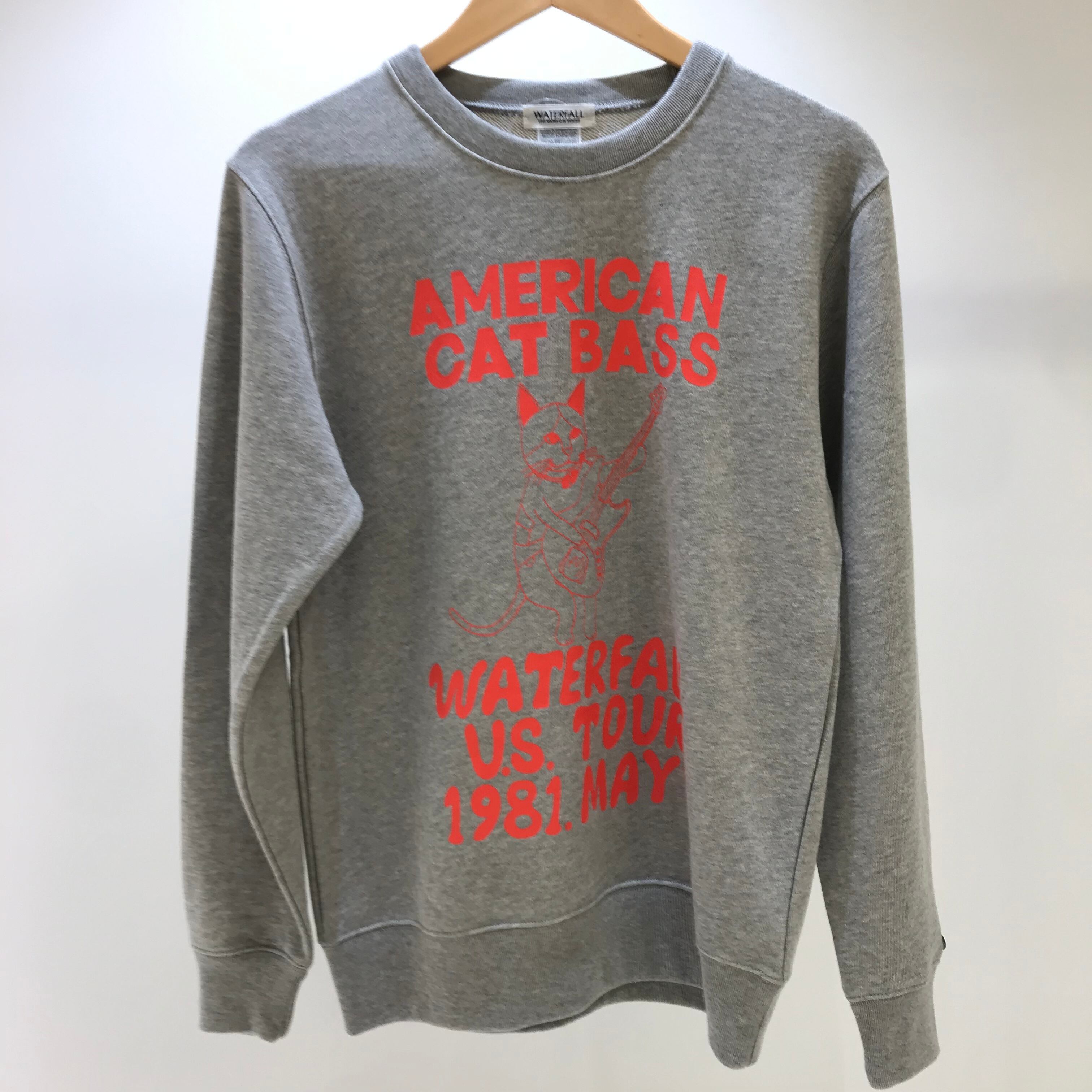 2025AW新アイテム。WATERFALL猫ツアースウェット(左袖手首にレコードワッペン)。猫ベースバージョン。オリジナルイラスト。架空のベースギターメーカー「Nyander」とのコラボ商品。生産数量限定品。